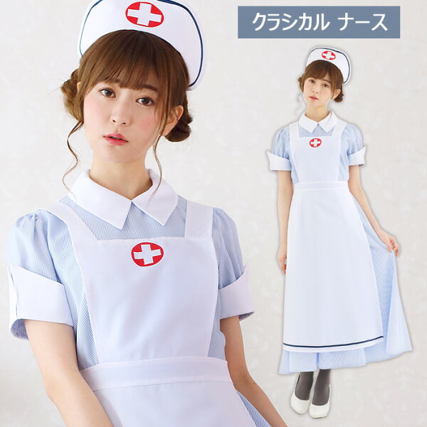 ≪Costume/Halloween≫クラシカル ヴィンテージロングナース爽やかなピンストライプワンピースのナースコスチューム。